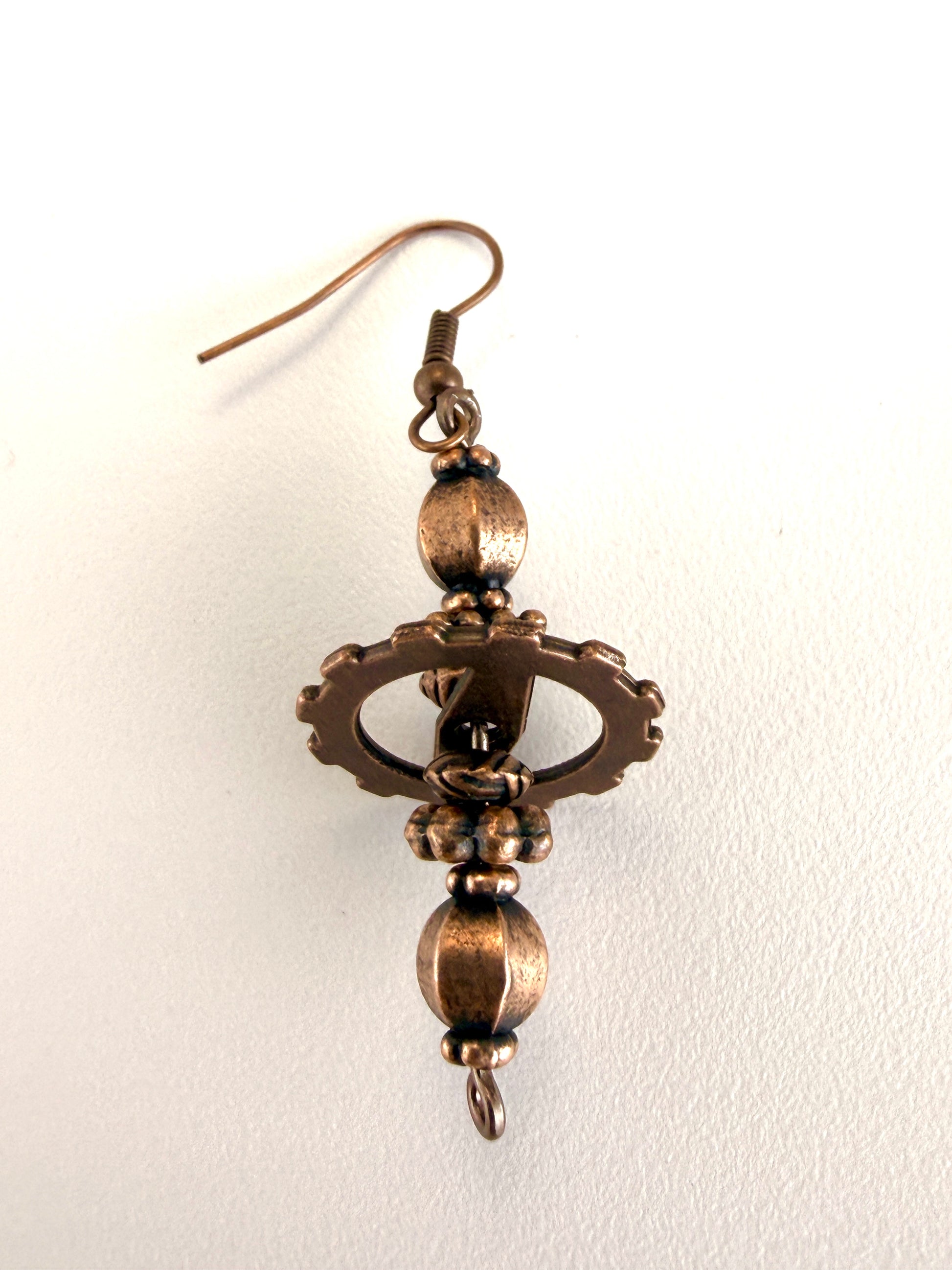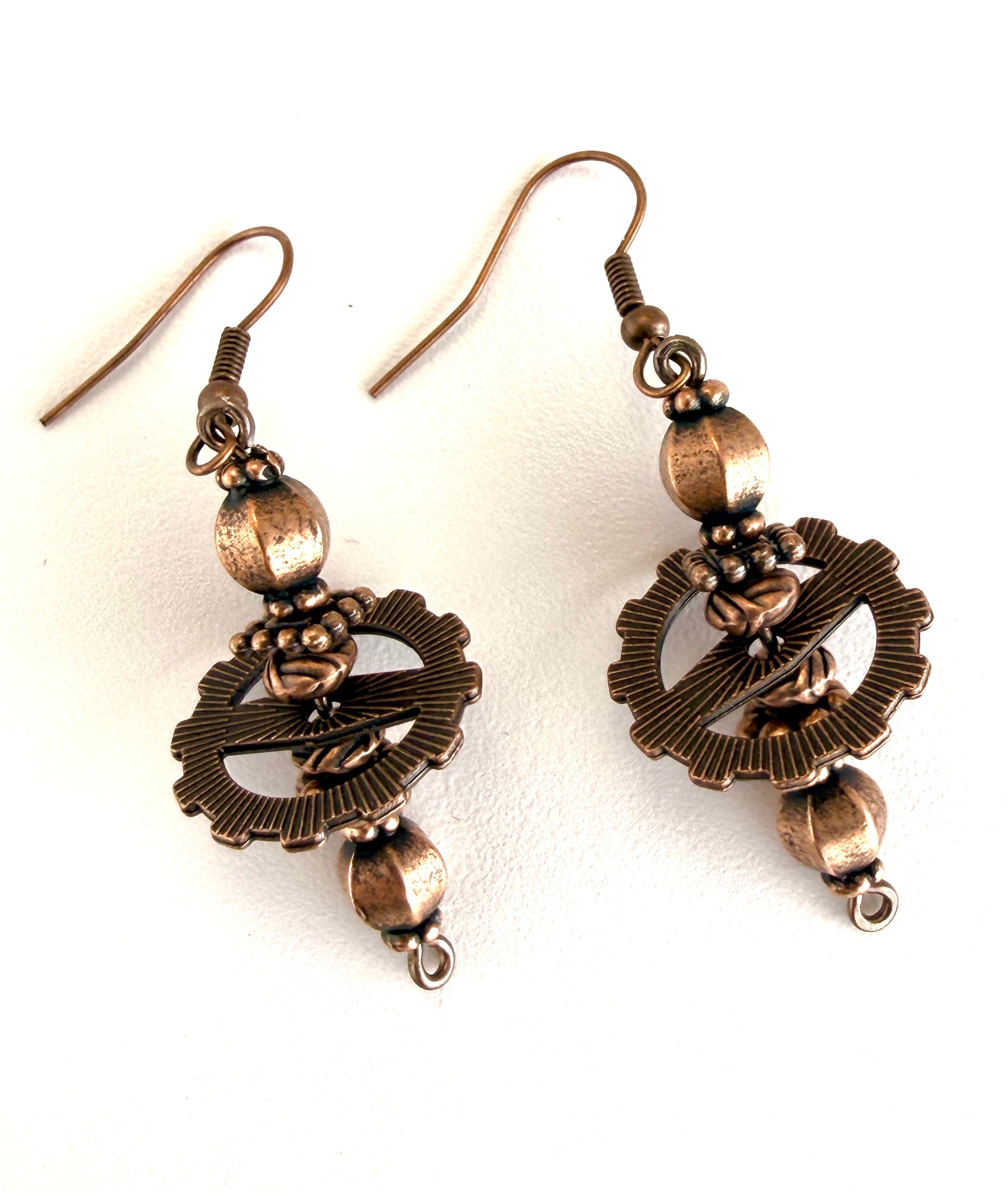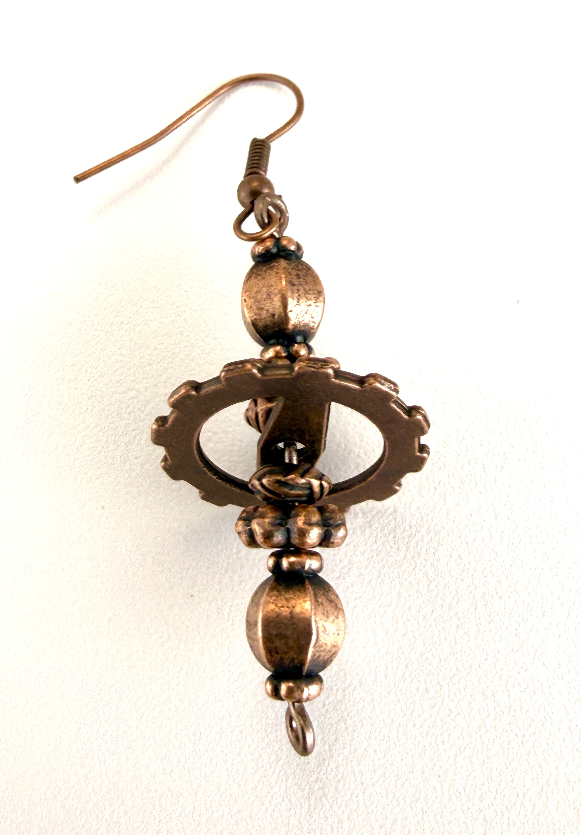 Hand-assembled steampunk earrings built from upcycled copper-toned components, featuring a textured gear motif between warm antiqued beads. The layered construction gives them movement and depth while keeping the overall profile light and wearable all day. Like we do - these are one-offs.